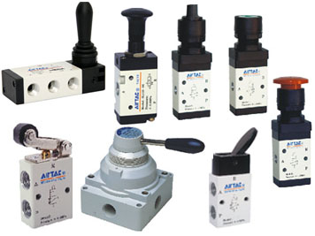 distribuitoare manuale actionate cu diferite accesorii: levier lung sau scurt, rola, buton ciuperca, buton ciuperca cu blocare, maneta, buton ingropat sau selector