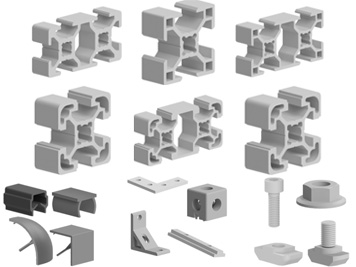 profile tip Bosch din aluminiu extrudat EN-AW 6060, 20×20, 20×40, 30×30, 40×40, 40×80, 60×60, 80×80, coltare, capace, balamale, suruburi, piulite, prinderi in unghi sau drept